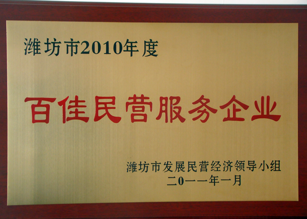 2011年1月底,我公司被濰坊市發(fā)展民營(yíng)經(jīng)濟(jì)領(lǐng)導(dǎo)小組評(píng)選為“濰坊市2010年度百家民營(yíng)服務(wù)企業(yè)”,并發(fā)放匾牌以資鼓勵(lì)。
