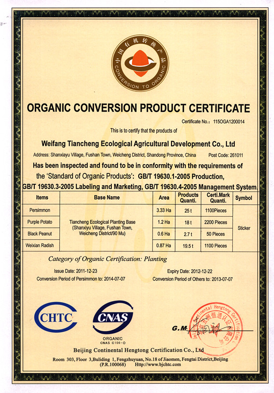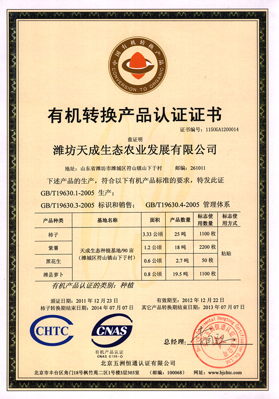 濰坊天成生態農業發展公司獲得有機轉換產品認證證書。