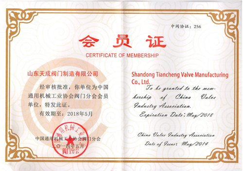 山東天成閥門制造有限公司經審核品準為中國通用機械工業協會閥門分會會員單位,并發放證書。