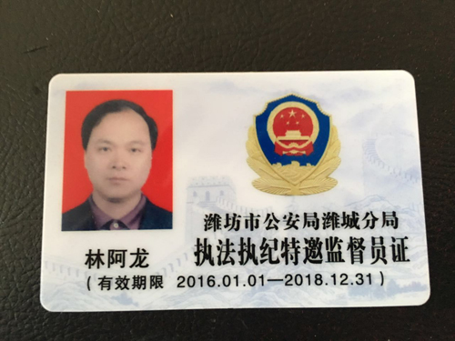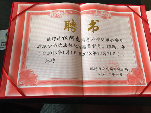 熱烈祝賀我公司董事長林阿龍同志被聘為濰坊市公安局濰城分局執法執紀特邀監督員。 (有效期:(2016.1.1-2018.12.31))